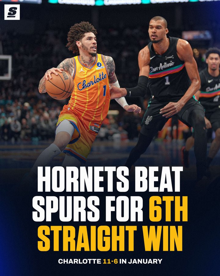 黄蜂坐镇主场大战马刺,虽然第一节26-30落后4分,但黄蜂次节打出35-17的攻势,下半场顶住压力,最终捍卫主场拿下胜利;此役米勒轰下26分8篮板,拉梅洛-鲍尔拿到16分8篮板8助攻,塞克斯顿替补8中7贡献21分,黄蜂全队6人得分上双。